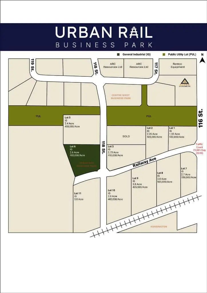 BUILD HERE! A high-visibility service station, car wash, industrial Business centre, recreation centre, oilfield business, warehouse and many other businesses will prosper here! Just 500 meters away from the nearest fire hall (great for insurance), Urban Rail Business Park is located on Costco's road (116 Street) on a major four-lane artery. It has unparalleled access to both Hwy 43 and Hwy 40. Vendors and customers are across the road in Richmond Industrial Park. If high exposure, easy access, and nearby amenities, communities, vendors, and customers are valuable to your bottom line, Grande Prairie's Urban Rail Business Park could be the perfect fit for you. Flexible zoning for commercial/industrial options and flexible lot configuration. Lots range in price from $400K to $550K per acre. Railway spur possibilities on lots next to the railroad.