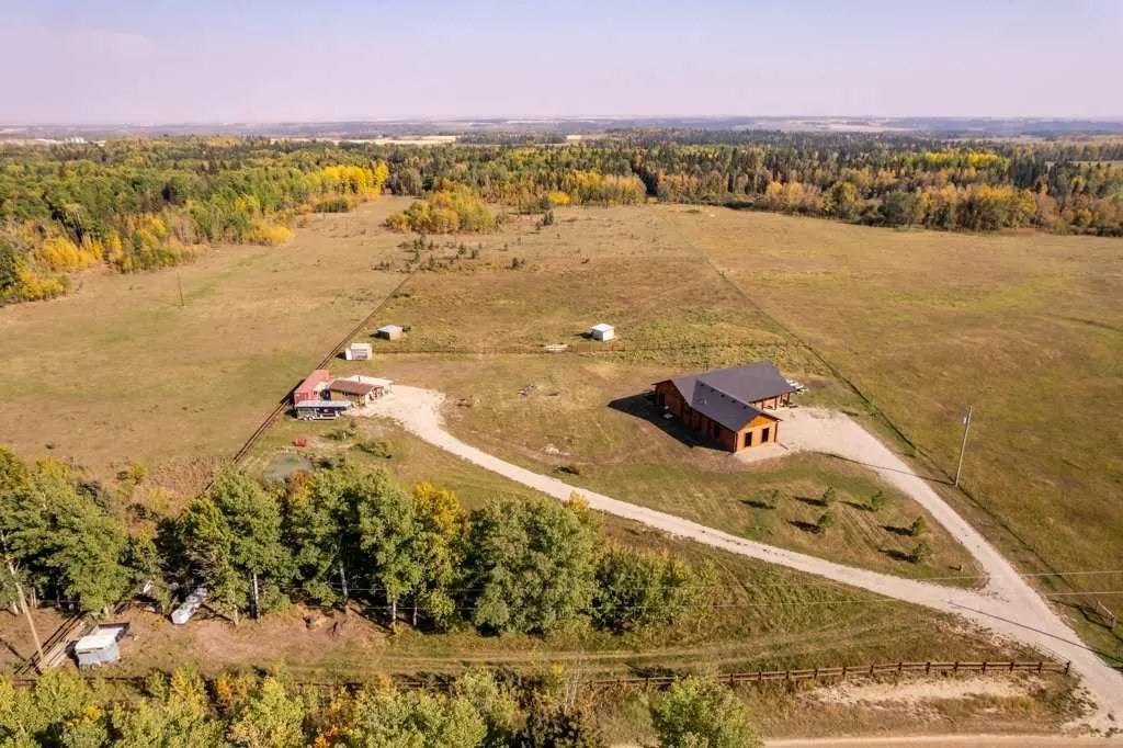 Welcome to Wood Spirit Ranch - a beautiful horse ready property where quality meets quiet comfort. Experience the perfect blend of rustic charm and modern comfort in this stunning log home, crafted from beautiful spruce and pine logs and designed with slab-on-grade construction and in-floor heating throughout. Set on 5 fully fenced acres complete with paddocks, auto-waterers and horse shelters, this property is a dream for horse lovers or anyone craving country living with contemporary convenience. This is the only parcel out of the quarter allowing for concentrated livestock (1 animal unit per acre). Step onto the welcoming front porch and into a bright, open-concept living space where timeless details meet modern finishes. The living room features a beautifully restored 1920s wood-burning stove as its centerpiece, complemented by warm wood-clad vaulted ceilings and tempered, tinted windows that offer added privacy and style. The kitchen is as functional as it is striking, showcasing crisp white cabinetry, granite countertops with a leather finish and stainless steel appliances. Insulated interior walls ensure comfort and quiet throughout the home. This 3-bedroom, 2-bath layout includes a double attached garage with huge windows which fill the space with light, man door, doggy door and drains leading to a catchment system beneath. The home also offers a boiler system, HRV and a convenient laundry rough-in with hot and cold taps in the garage. Outside, you will find thoughtful touches that make this property stand out even more. A tranquil pond with its own thriving ecosystem invites you to relax and enjoy nature, while raised garden beds provide the perfect space for growing your own produce. The property also includes a prepared gravel pad currently where the cabin sits serviced with electrical and water. With every detail carefully considered, from the tinted windows to the vibrant outdoor spaces, this property offers a rare opportunity to enjoy modern log-home living with authentic country charm.